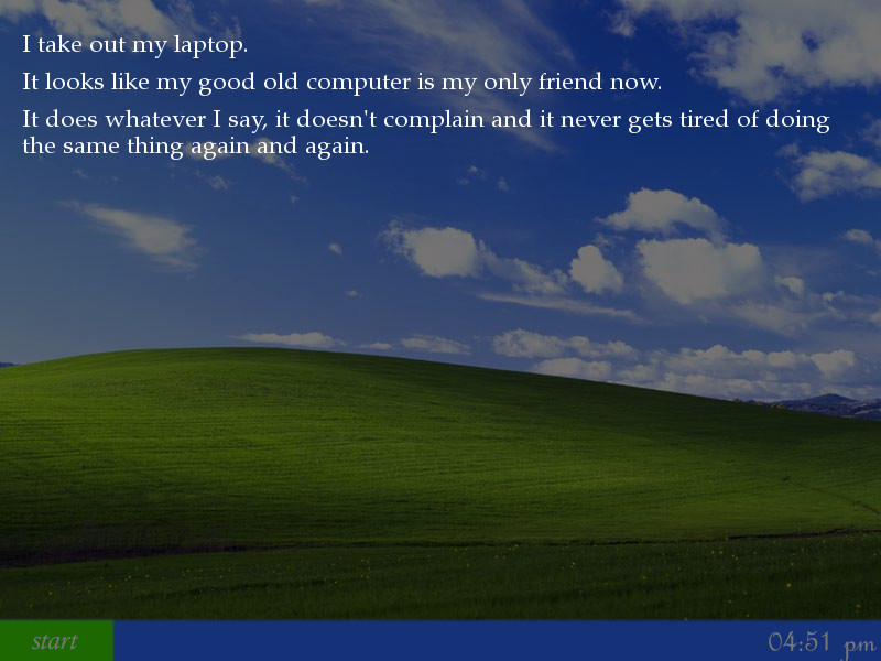 Our protagonist is sad. His bride-to-be Emma just died. And he thinks that his friends and family doesn't really love him. They decide to send him to a holiday resort so that he can forget Emma. But on the train, he received an email from Emma. How is this possible? Renai.us]
