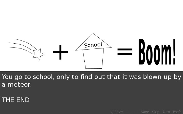 A really short and fairly-dumb visual novel. It's a port of P7's Stupid Script Novel 2.0. Ren'Py Games List]