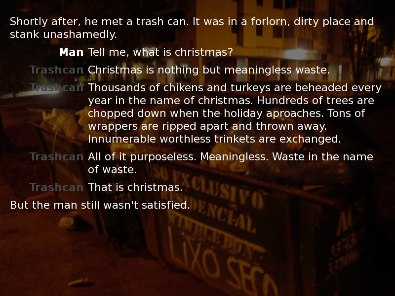 A small Christmas card in visual novel form, looking for the answer to... the Christmas question.