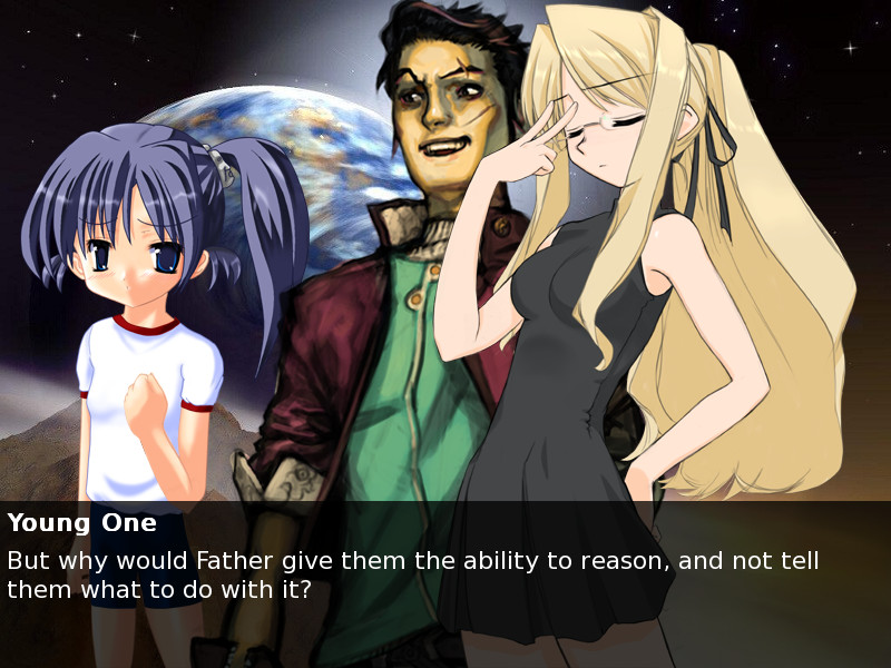 The story is based on the song "Right in Two" by Tool. The story is basically about three angels contemplating humans and their existence. Lemma Soft Forums]