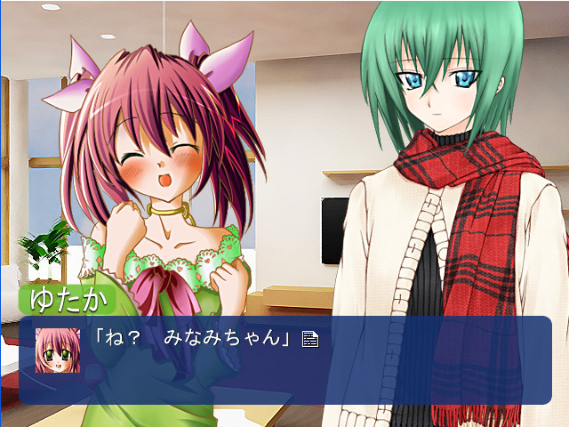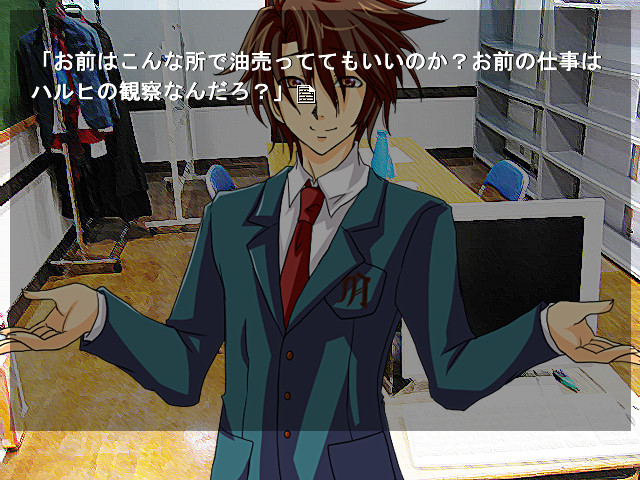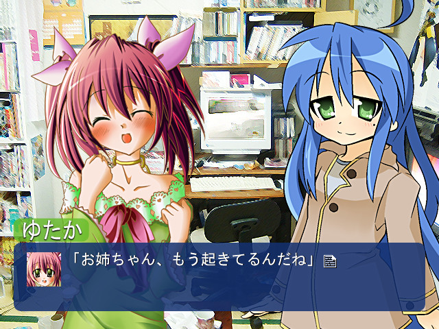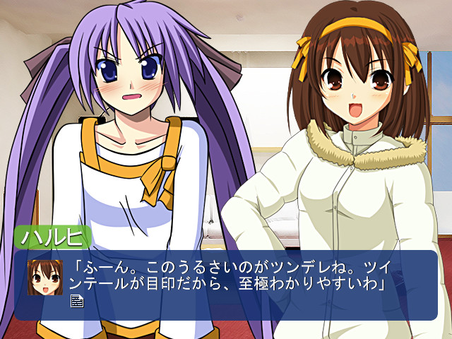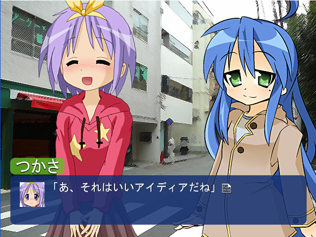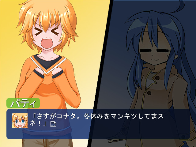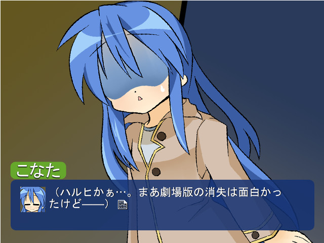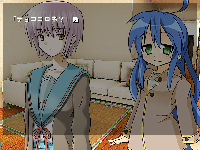 A doujin visual novel where Konata from "Lucky Star" goes to the world of "The Melancholy of Suzumiya Haruhi" and Haruhi goes to the world of "Lucky Star". The Official Site]
