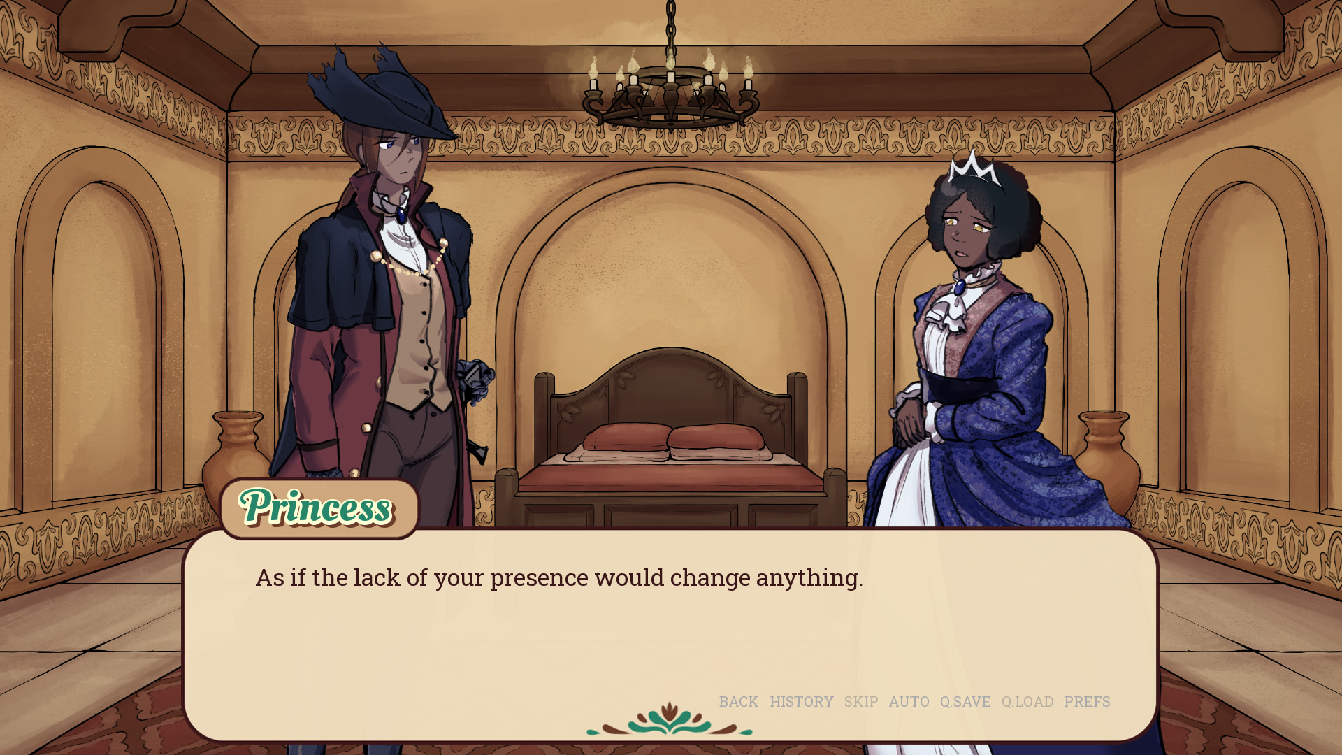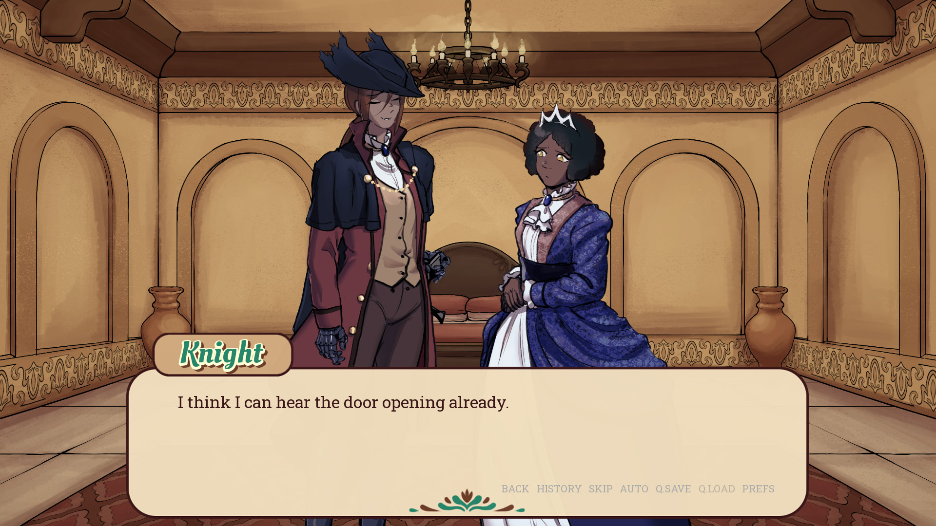 The royal sorceress Soledad has trapped the crown princess and her surly erstwhile lover—a knight returning from her noble crusade along the coast—inside a locked bedroom inside the palace. With only hours before the royal banquet, will the princess and her knight be able to stop their squabbling for long enough to find a way out? Or will they be doomed to its beige walls and cozy but nondescript furnishings forever?