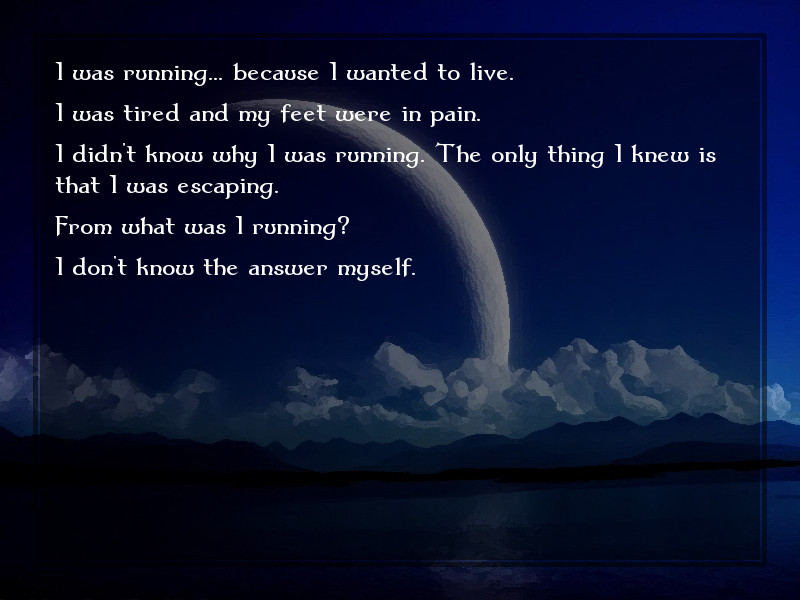 I would have repeated everything until I corrected all my mistakes. But even if I repair my mistakes, they are still present; lost in the depths of my memories. Little by little, I start to remember my life, my memories... But they look foreign to me. I feel like I am new to this world, as if I've just been born.