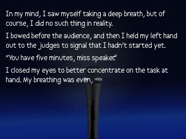 The story is set inside an auditorium in the middle of an impromptu speaking contest.