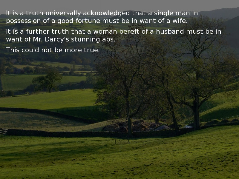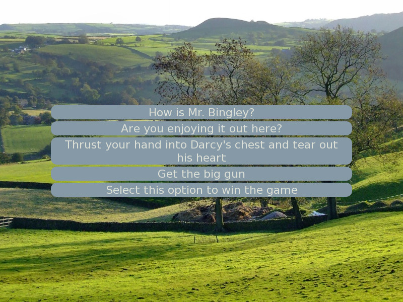 The latest in the Pride And Prejudice Fan Fiction series! Now with none of that parser stuff, 'cause that takes forever to program!