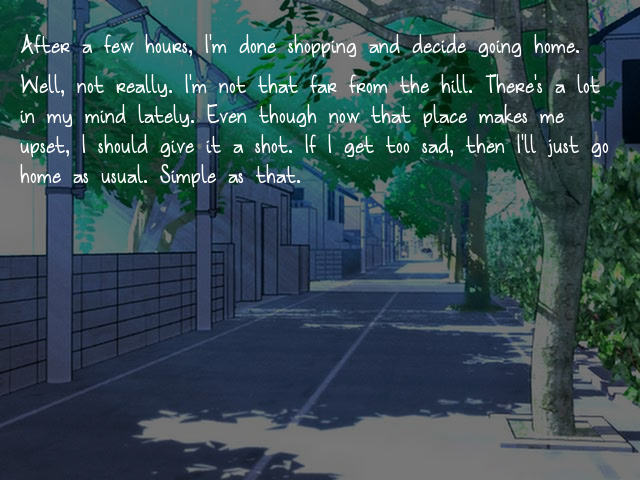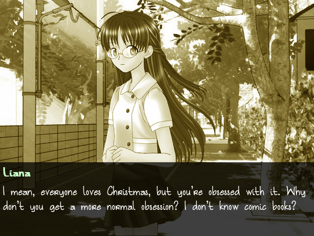 The protagonist usually loves Christmas, but isn't that excited this year. After meeting Liana, a girl who has been the protagonist's rival (even though both had a crush on each other) for years, s/he learns why. Ren'Py Archive]