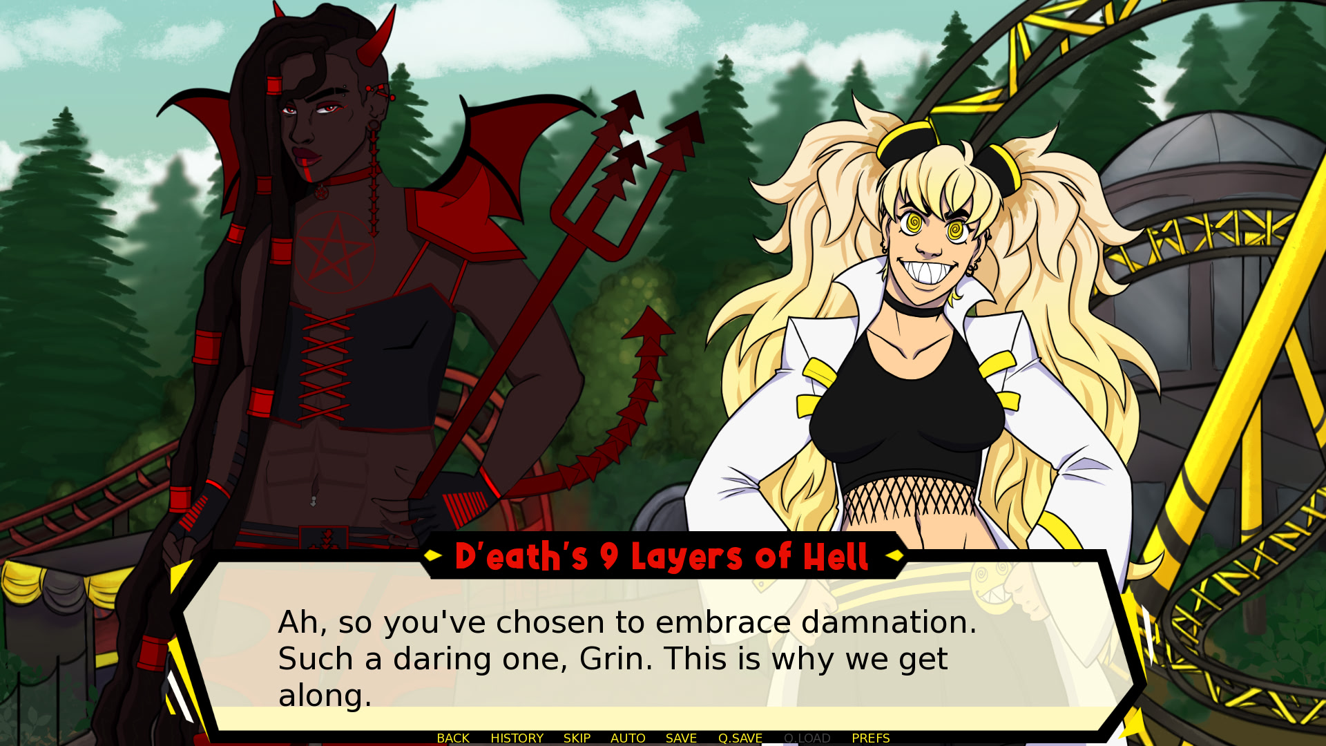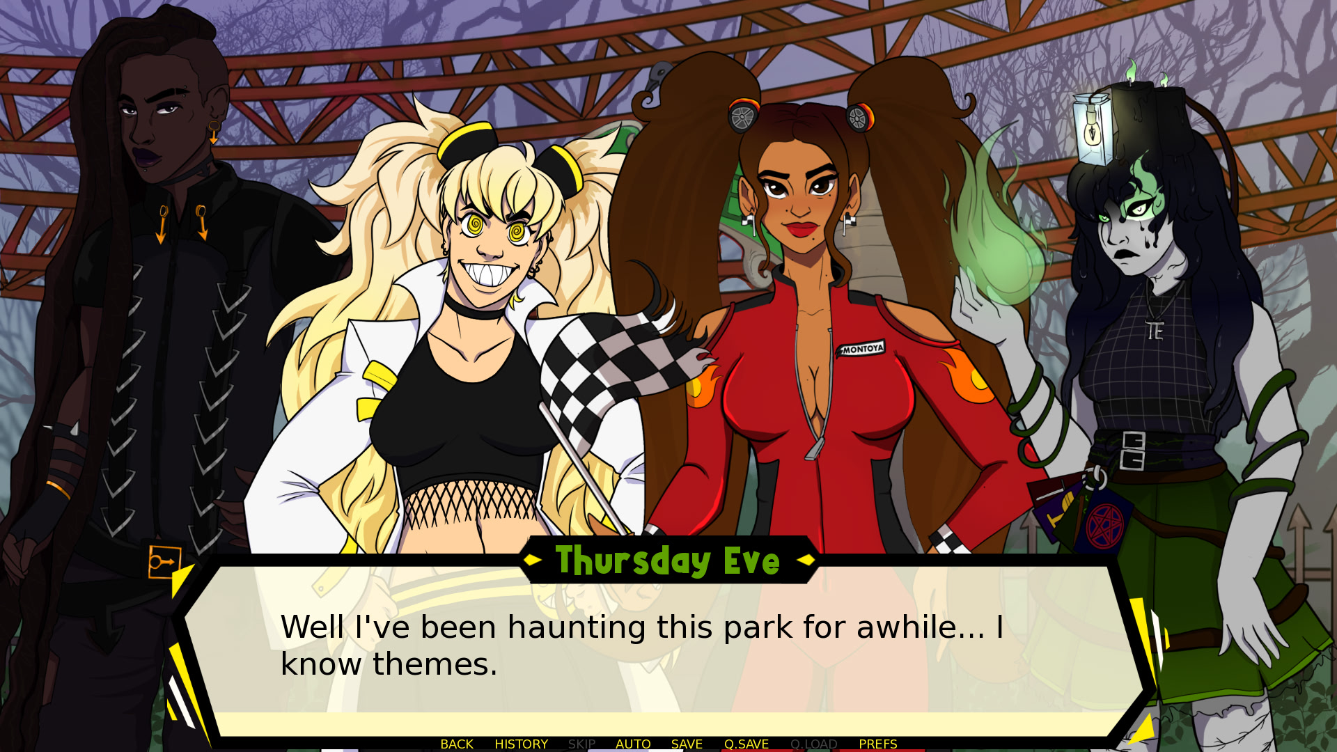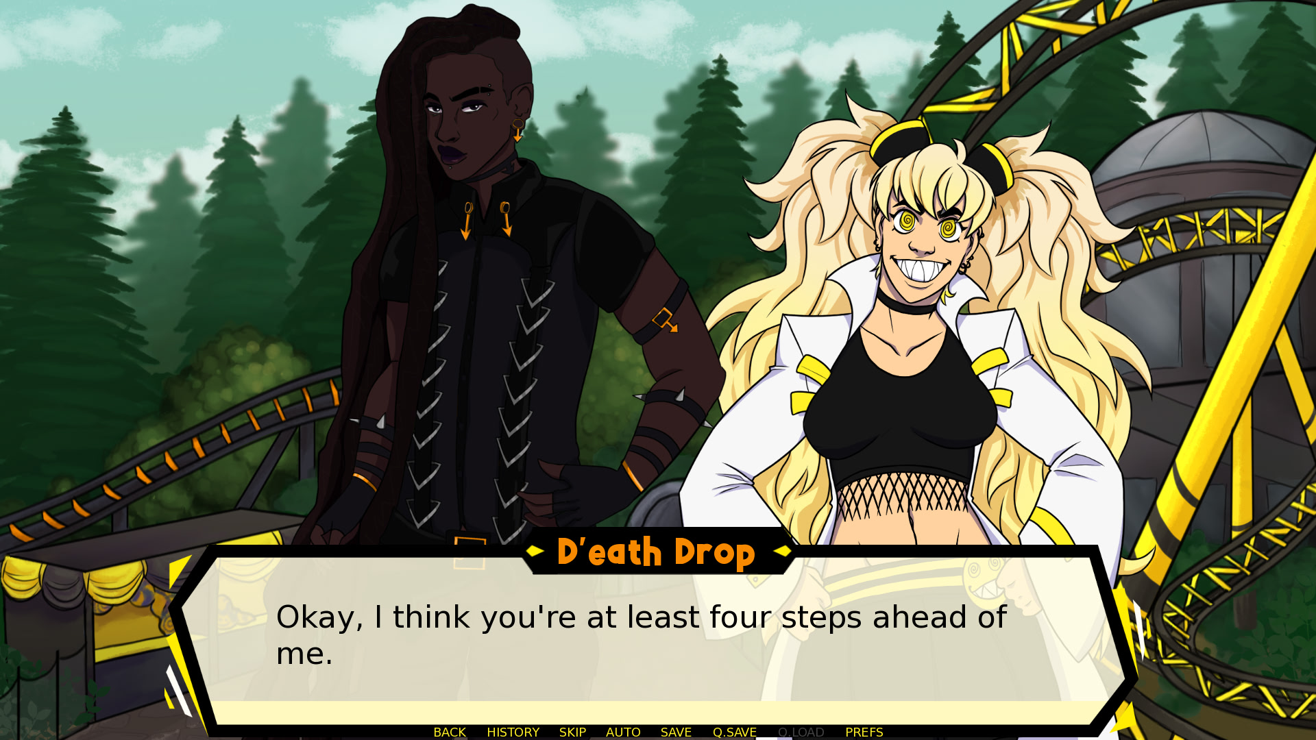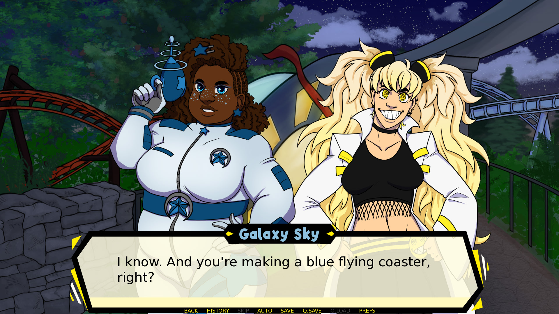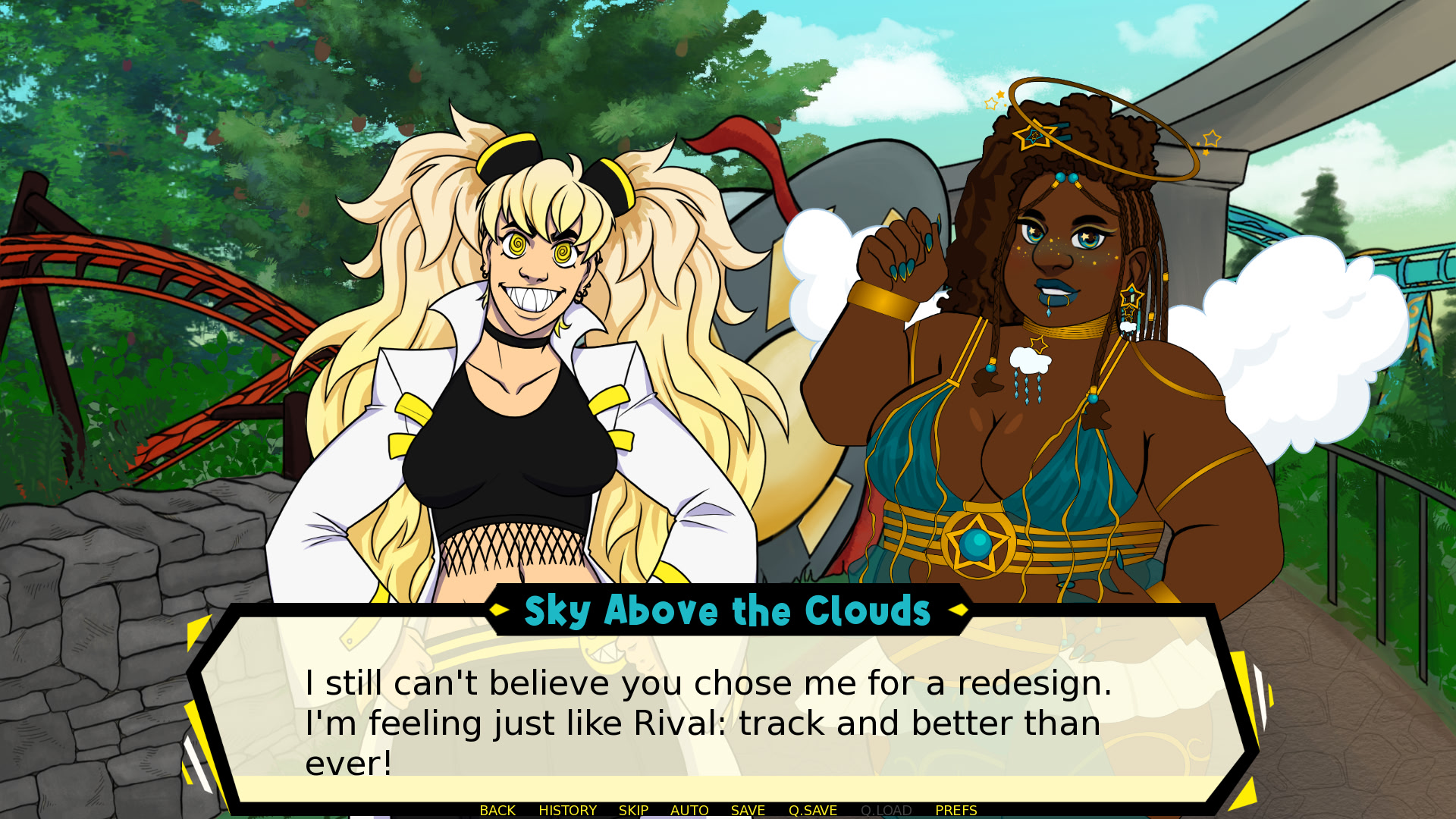 Coaster Kisser is a satirical love letter to a real theme park. Play as Grin Barrett, the roller coaster with the world's most inversions, as you design a new roller coaster for the park with the help of your friends... and maybe even find love along the way.