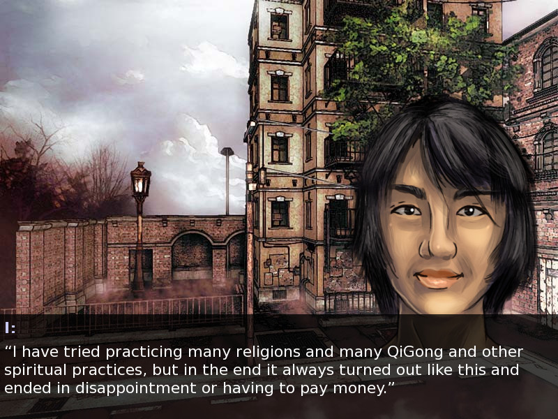 A medium length Visual Novel about the persecution of Falun Gong in China. It was originally created as an entry for the "branching story" contest held by "Citizens for a Global Solution" (a kind of human rights organization).
