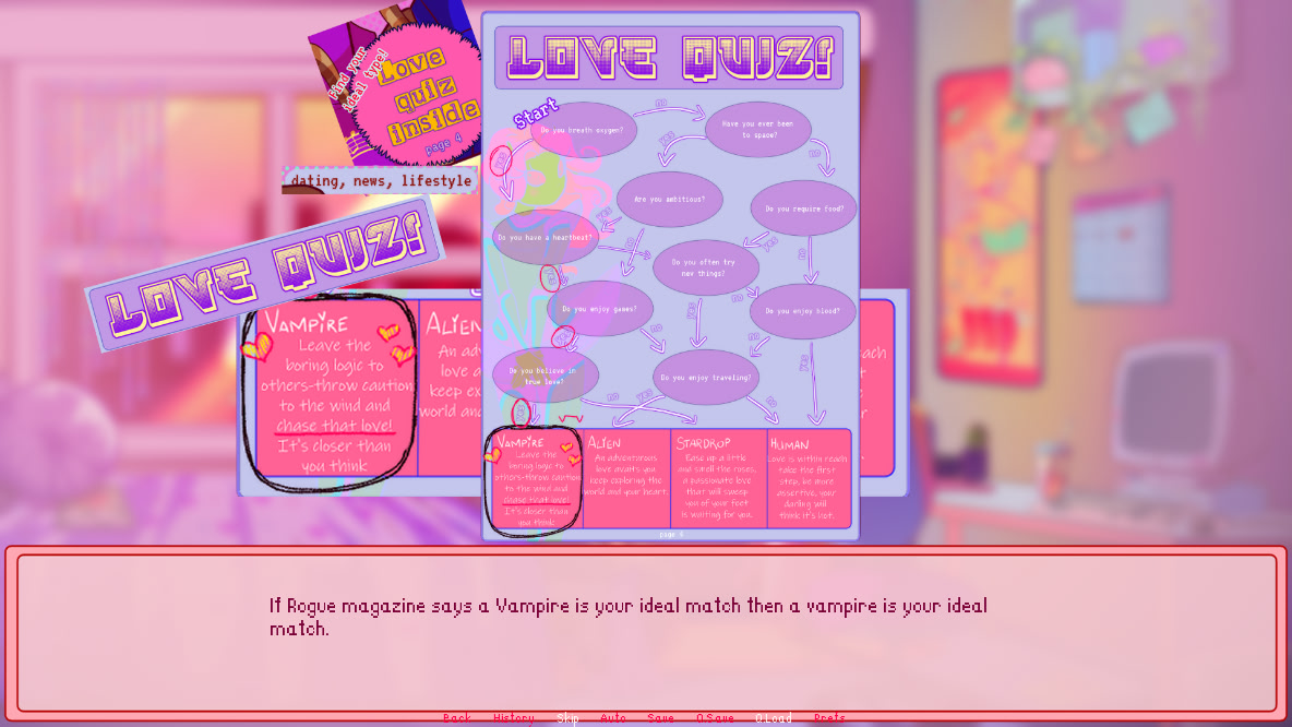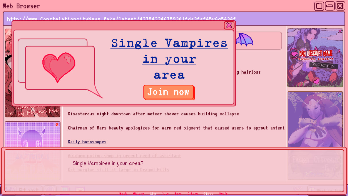 Sketchy ad? No! This is the universe giving you a sign! After a quiz in your favorite magazine said that your ideal type would be a vampire, you come across an ad for single vampires in your area. This might be your shot at love after a whole lot of heartbreak. itch.io]