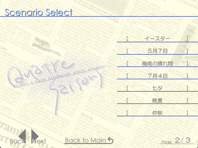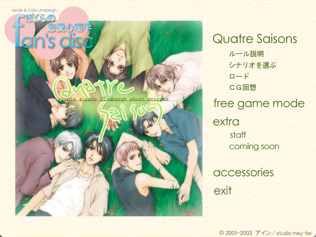 Among other goodies there are 20 short scenarios with mini-games centering on each character. There are story pieces not included in the main game. These are past story, coupling story and afterstory. vndbreview]