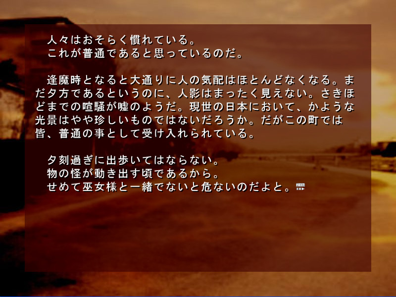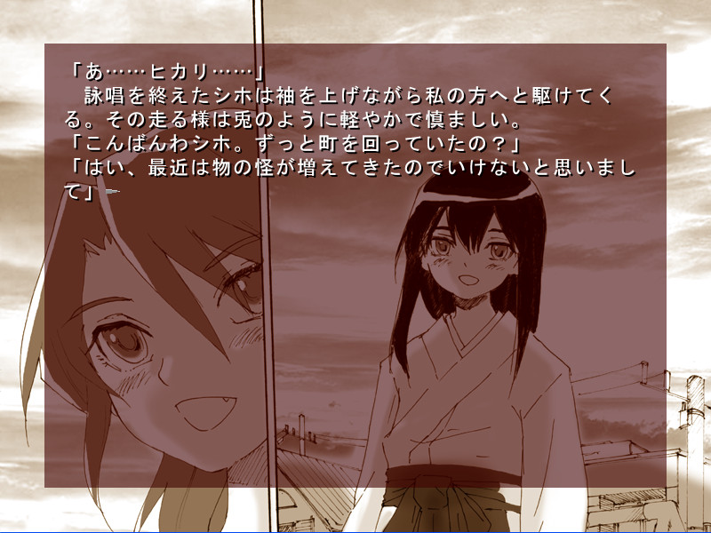A romance visual novel. In a town where youkai are very frequent, a recently arrived girl with oni blood usually wanders at the time of twilight exterminating mononoke. Also realizing that job are a mysterious man with tengu skills and a very talented miko, classmate of hers.