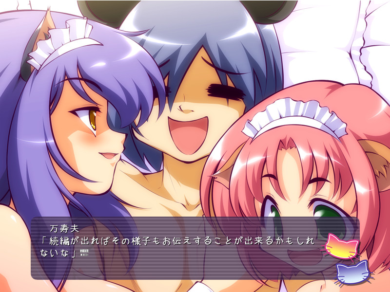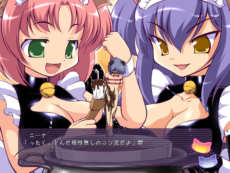 However he gets caught by the two cat maids working in there (and whose boss is a real masochistic BDSM type, for instance he dresses the maids in leather).