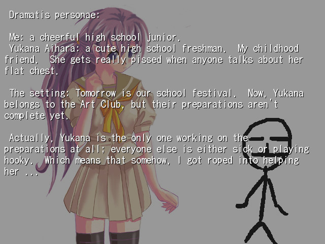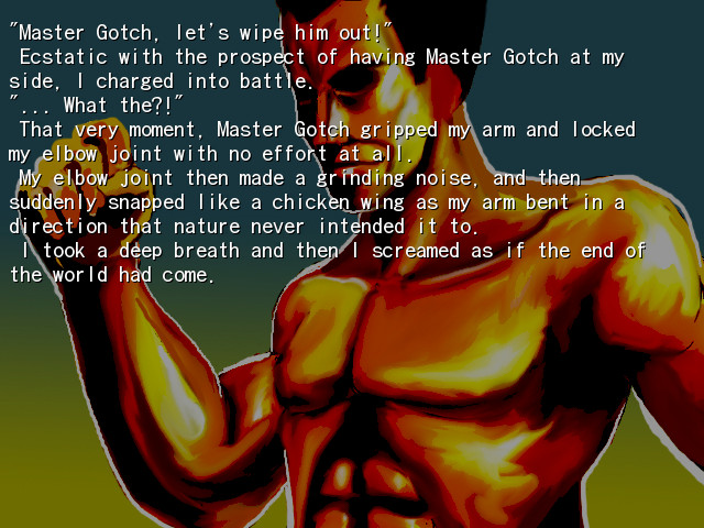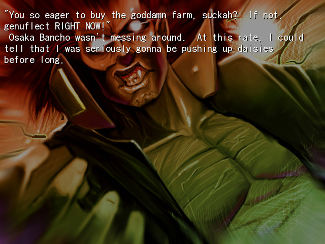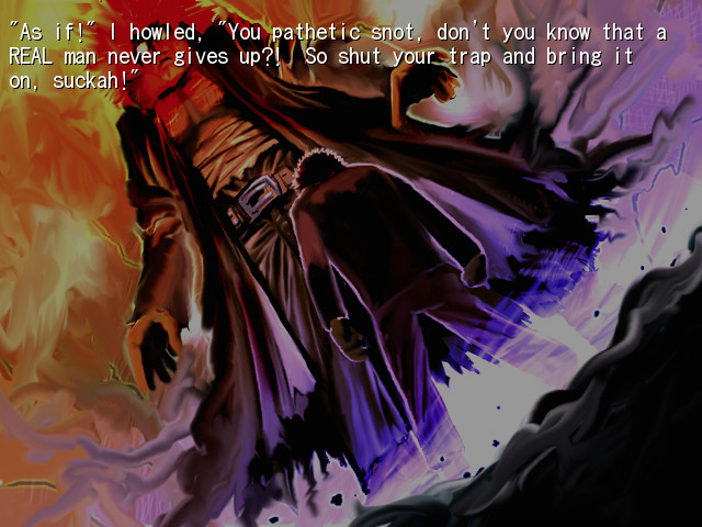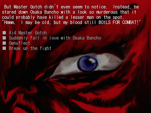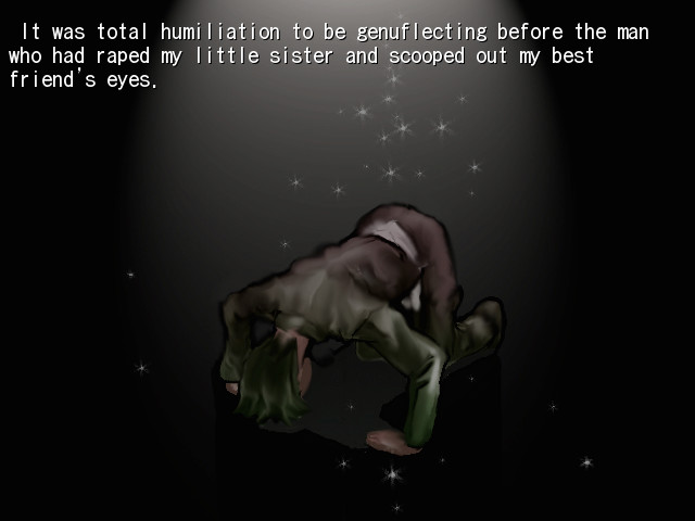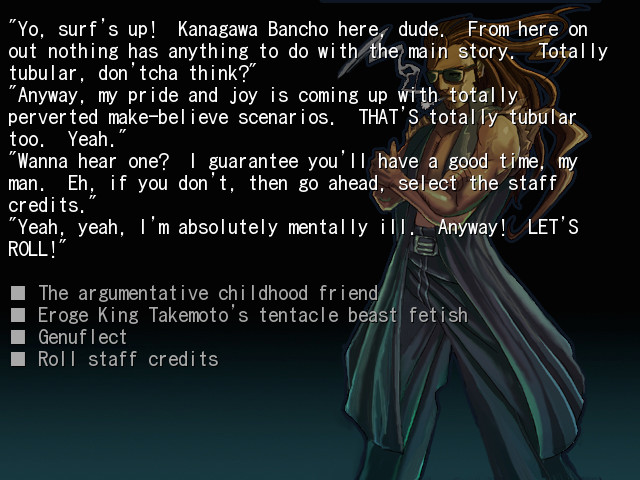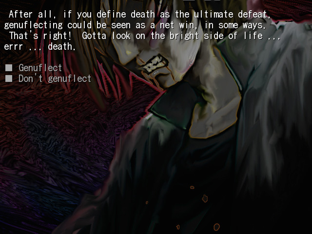GENUFLECT OR DIE! Now, finally, the lunatic novel game which received enthusiastic applause from ... an incredibly small number of rabid Japanese fans ... comes to invade the English-speaking world! This piece will have you going OMG, WTF, and OTL all at once -- and as such it is entirely not appropriate for those under the age of 18 or those with delicate sensibilities. Consider: at different times, it features things like tentacle beast rape, kamikaze suicide attacks, and clubbing baby bears to death with crowbars. Proceed with utmost caution.