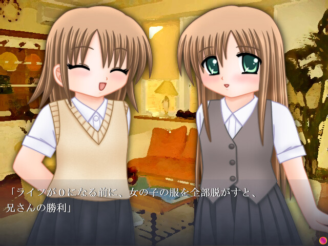 Strip rock-paper-scissor game with your twin sisters. Win over them and take their clothes off. After you successfully remove their clothes, you are able to have sex with them! DLsite]