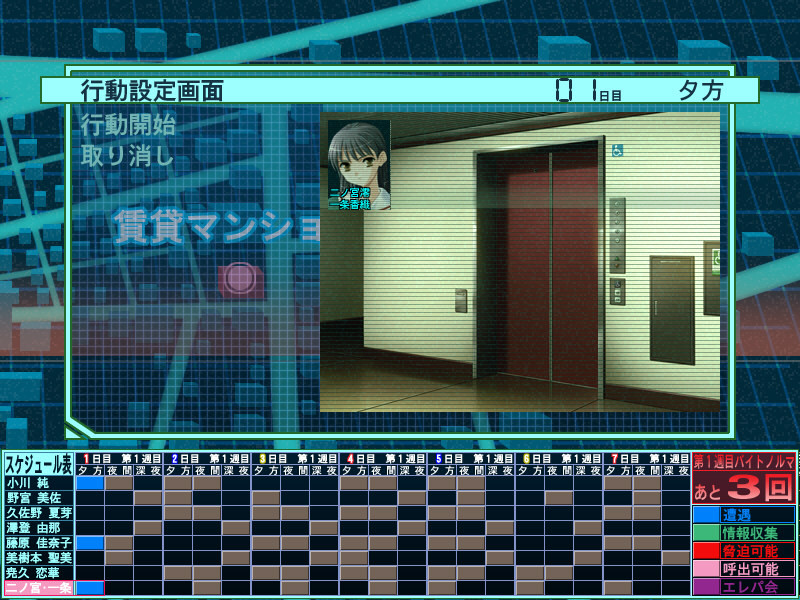 Main character works as a night guard. He watches OL working overtime and returning late from work every day. He decides to have some action and locks himself together with one such woman in the elevator. With escape ways cut out, he is the one to control the situation. vndbreview]