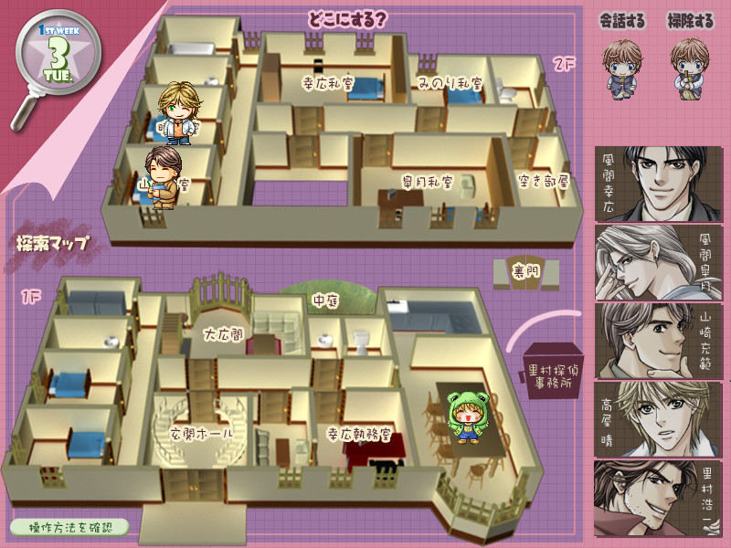 There are five men living there, all with secrets of their own. Tooru must search for clues and talk to the inhabitants of the house in order to solve their mysteries.