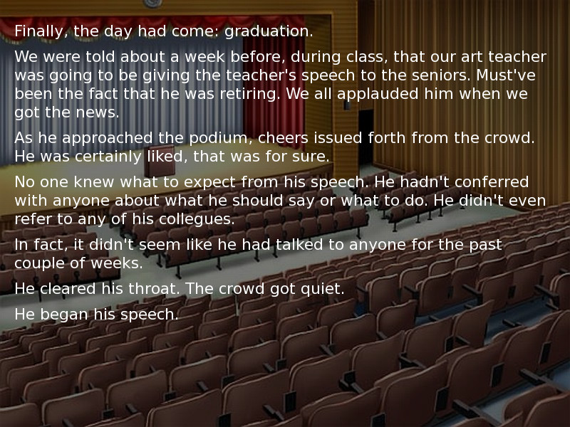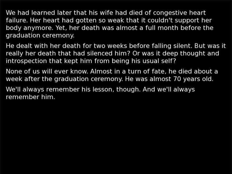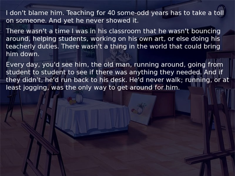 A very short kinetic novel in the style of Adagio, you have an energetic art teacher who never seems to quit being helpful. Then comes his retirement after 40 years of teaching, and he makes a speech during your graduation...