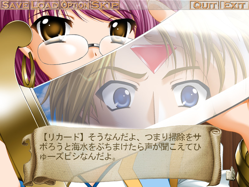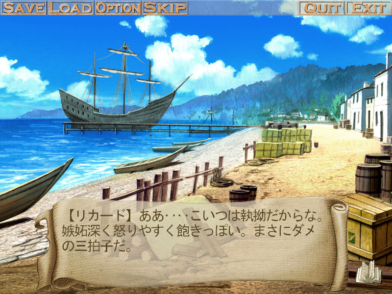 Main character Ricardo is a captain of a pirate ship. His crew is full of energy in search of riches. The jewel stuck in the ship deck hints a way to the legendary pirate paradise with tons of gems. All directions are available for new adventures. vndbreview]