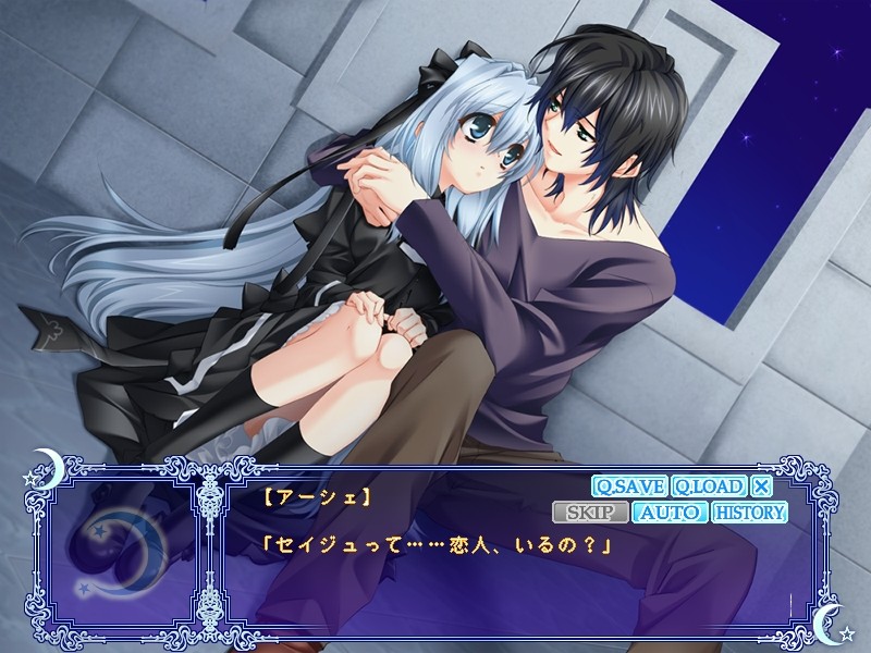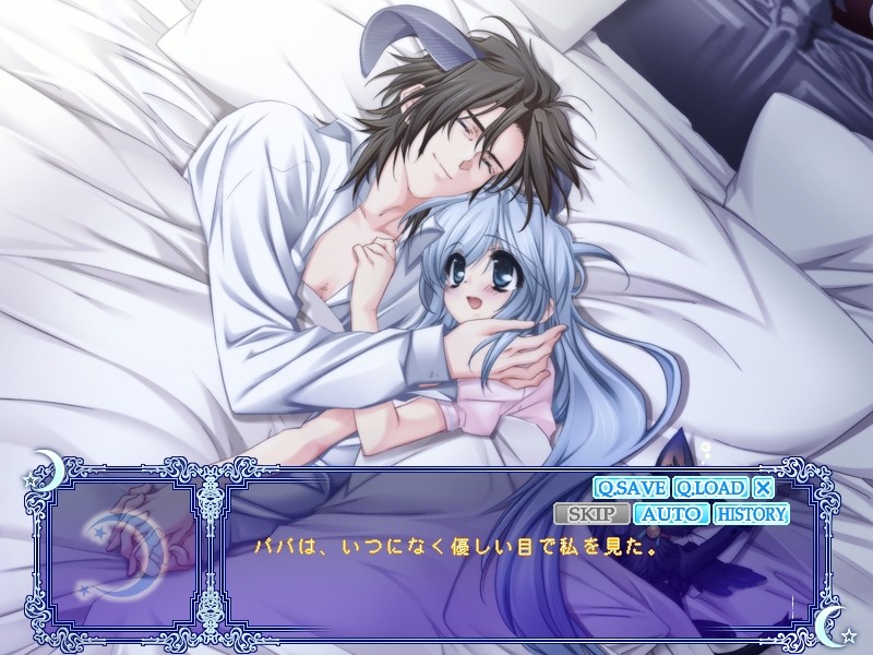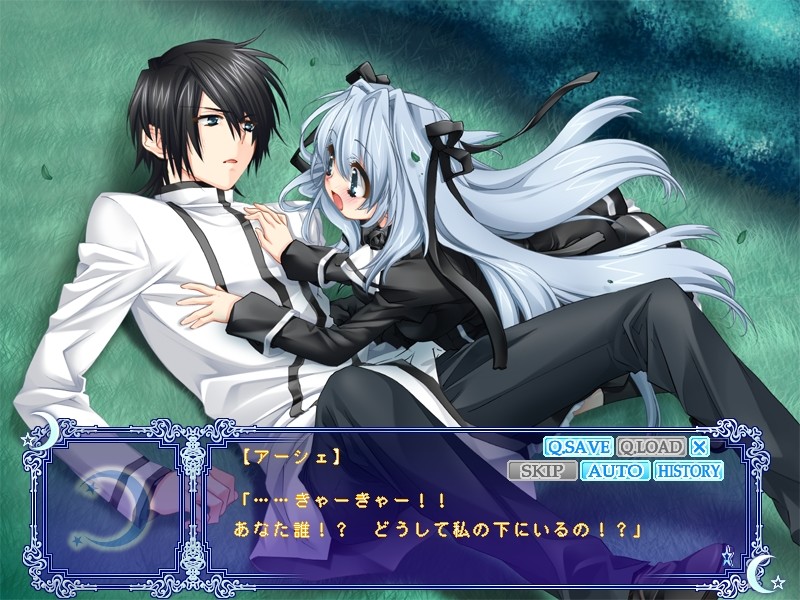 This fandisc takes place before the original game, Under the Moon. Ashe is simply the princess of the demon kingdom, and has daily life princess problems to deal with. She has dance lessons, and other various activities that she has to deal with….however because she’s also a princess, she hasn’t been let outside of the castle doesn’t know much about the world outside. However she isn’t alone because she has her father there, her nursemaid Baaya, and her cute little cat friend Kyle! But….one day she meets two twins around her age, who were assigned to be her bodyguard by her father…