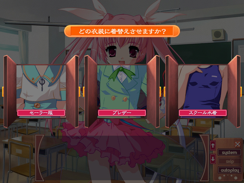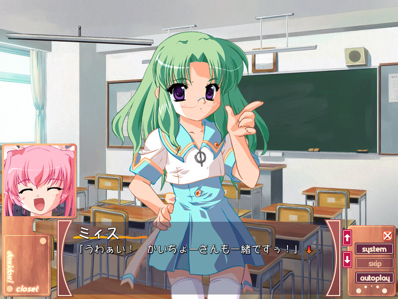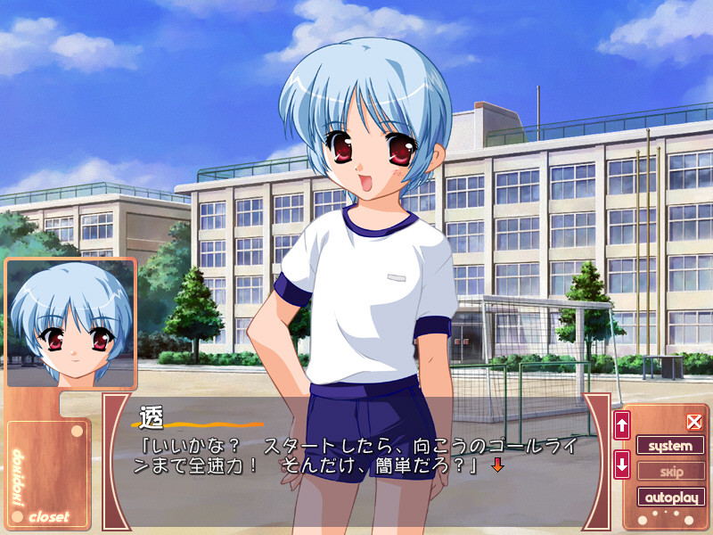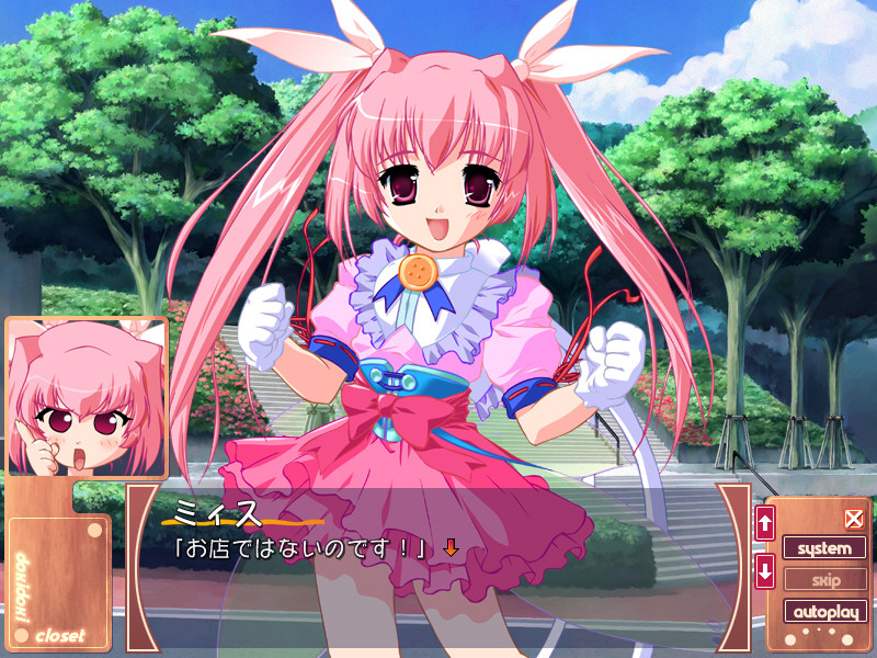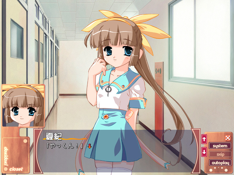 The tests are over, and summer vacations begin. Suddenly a girl falls from a closet before main character. She turns out to be from a spirit wold. Her intention is to help people with the power of changing clothes. vndbreview]