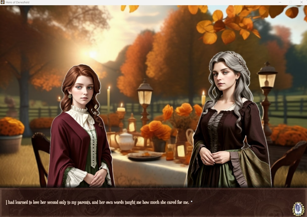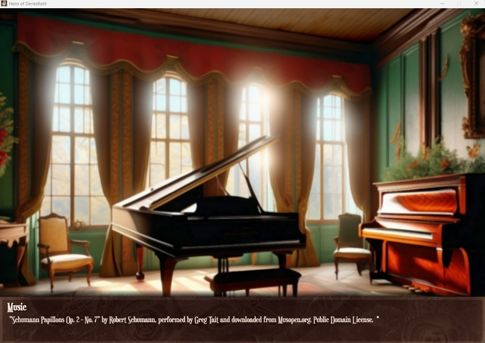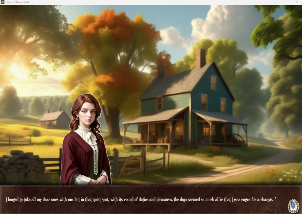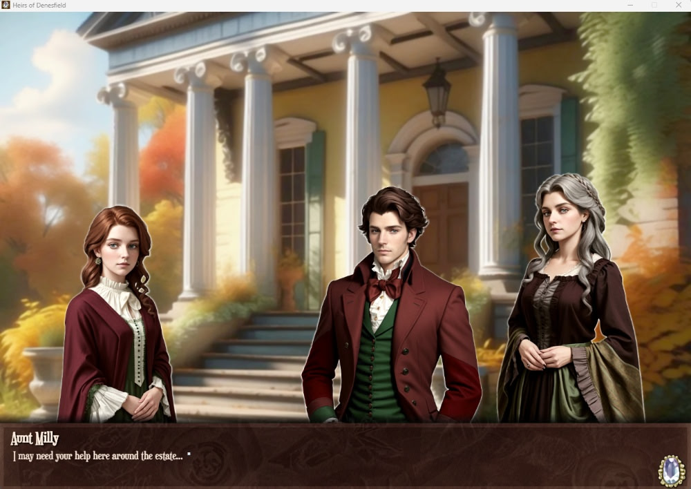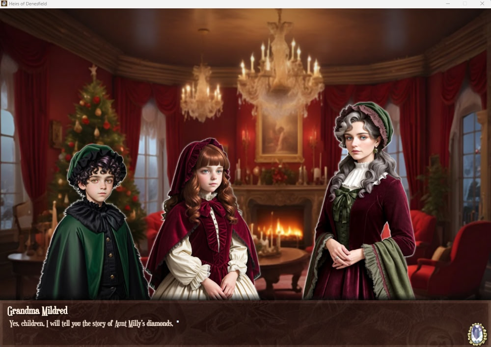 "Heirs of Denesfield" is a charming, linear visual novel based on Ruth Lamb's short story titled "Aunt Milly’s Diamonds." This Christmas-centered, Christian tale has been updated for today's audience and woven with a charming romance between the main characters to add an extra layer of engagement.