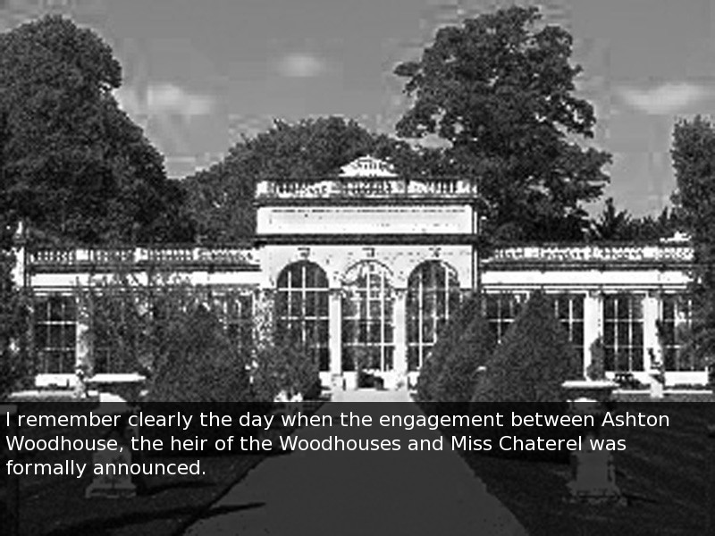 Jane Whitman arrives to Woodhouse estate to celebrate announcement of engagement between Ashton Woodhouse and Miss Chaterel. She is waiting for approval with Frederick Woodhouse herself. This meeting becomes a place for detective mystery to unfold. vndbreview]