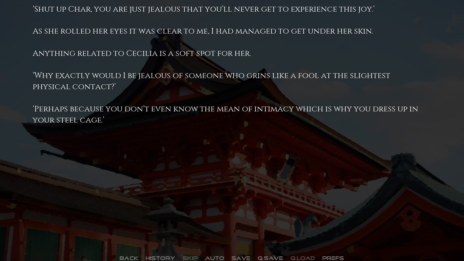 Once upon a time Kiyomi lived quietly alone in her derelict forest shine, but those days are long over. Now Cecilia and her knight retainer Char have become a permanent fixture in her life despite the rocky first encounter. Where once there was just the whistling of the trees now there is chatter and laughter. Kiyomi can no longer imagine a world without Cecilia next to her.