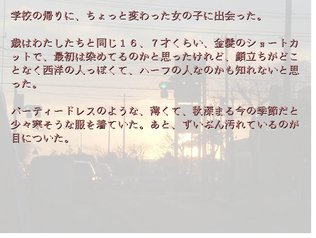 On the way home from school main character meets a mysterious girl Shizuru and wanders through the imaginary landscape full of cosmos images. vndbreview]