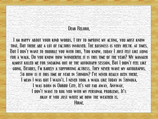 In Idol/TYPE you and your idol, the lesser-known supporting actress Hirae Erishima write letters to each other. At first they were just fan letters. But now, is there something more?