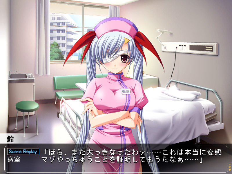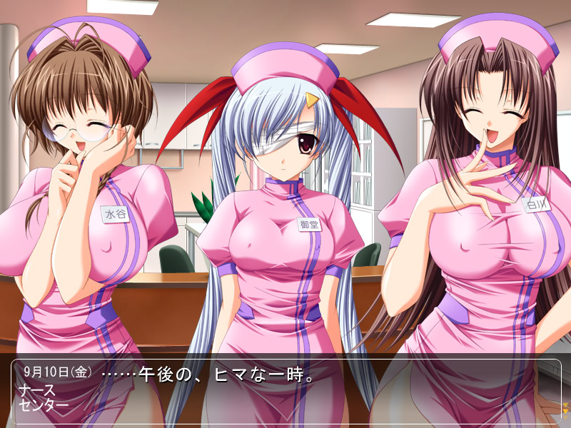 Main character works part-time at a convenience store. Nurses often come to this shop to buy lunches. One day protagonist gets to a hospital and meets the same nurses! He gets one step closer to realizing his hidden desires. vndbreview]