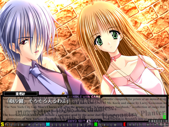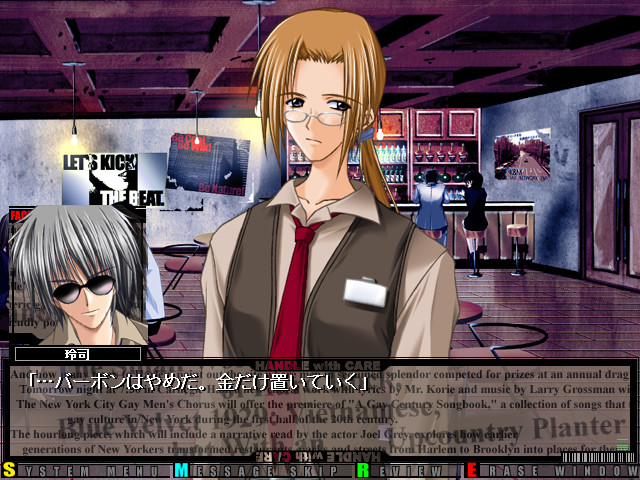 Our hero was the vocalist of the legendary rock band "Bloody Roses." Presently, his activities with the band are on hold. At one of the live houses he played at, he met an extremely talented vocalist named Sahara Shion. He takes it upon himself to help her in her career... As a player, it is your goal to eventually bring this beautiful talent on stage at the live house "Moon Rouge."