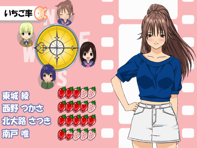 Strawberry 100% chronicles the school years of Junpei Manaka, a student and aspiring movie director, and his relationships with the girls that enter his life. At the start of the series, he encounters a mysterious and beautiful girl on the roof of his middle school, but does not remember anything about her other than that she wears strawberry-print panties. She leaves before he can talk to her, but he finds a notebook nearby, belonging to Aya Toujou, an ordinary-looking glasses-wearing girl who is a gifted writer. The two become friends with the common ambition of turning great stories into movies. Thinking that Tsukasa Nishino, the most popular girl in his school, might be the mystery girl, he asks her out in a bold confession at the chin-up bar, and is surprised when she accepts. He later realizes Tsukasa is not the mystery girl but chooses to continue their relationship anyway. He places into Izumizaka High, but learns that Aya has given up an offer to the prestigious Oumi Academy to attend Izumizaka with him and that she is the mystery girl.