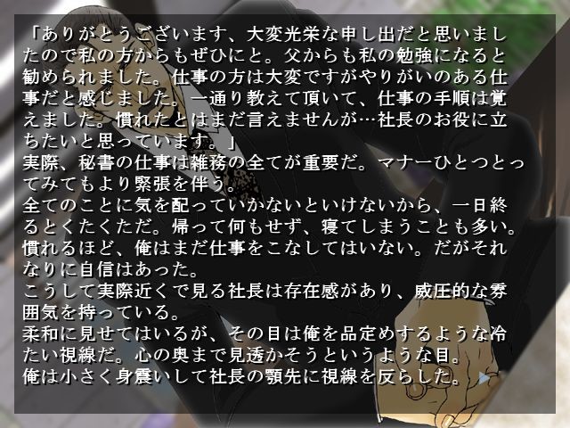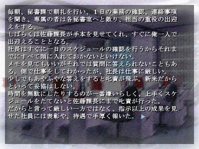 Main character is graduating student. With his father's mediation he gets a position of a secretary in business partner company. He is busy every day and prone to making mistakes. vndbreview]