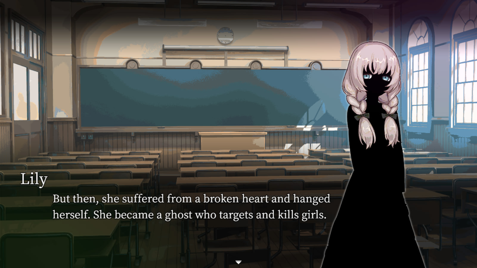 A horror game about a needy female ghost. A trio of close-knit occult club girls gather late at night to enjoy telling ghost stories. Little do they know that Miss Choker, a ghost that targets girls, is just dying to appear...