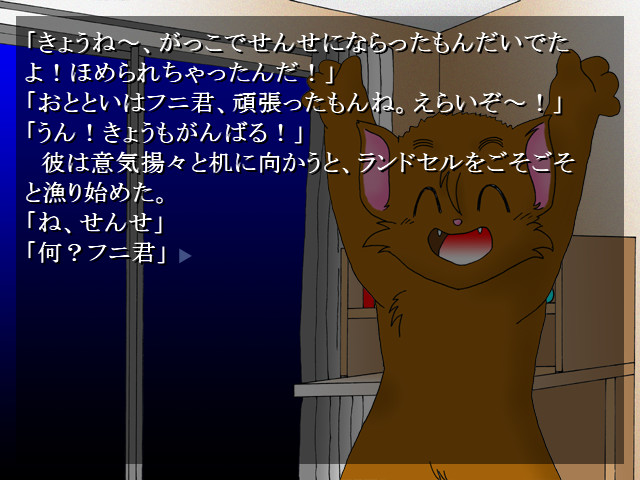 This year he is desperate to get some. And he gets a bar of chocolate... from a furry kid Funi. The kid likes to study, but he has difficulty washing his head, so he asks protagonist to lend a hand. What will main character do now?