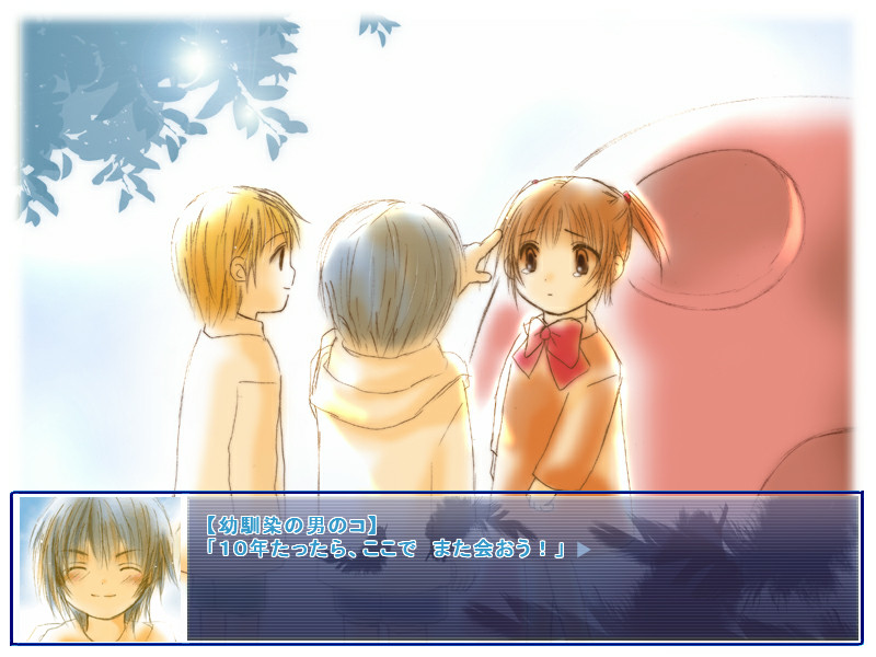 Parents have prepared main heroine's engagement with one of two childhood friends. She returns to home town and starts living with the two of them to decide on the person to marry. There is also an option to choose someone entirely different, like a teacher or a cashier boy at the local shop. vndbr...