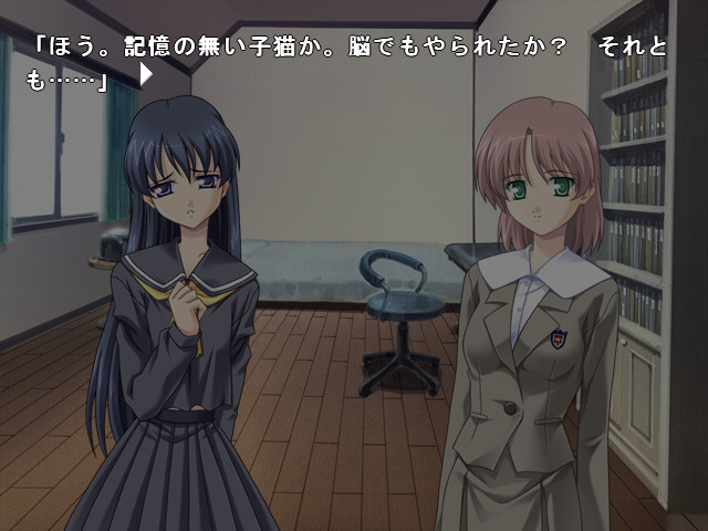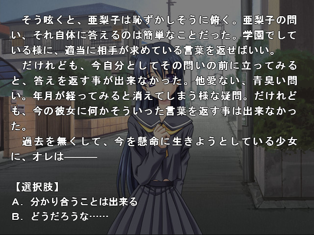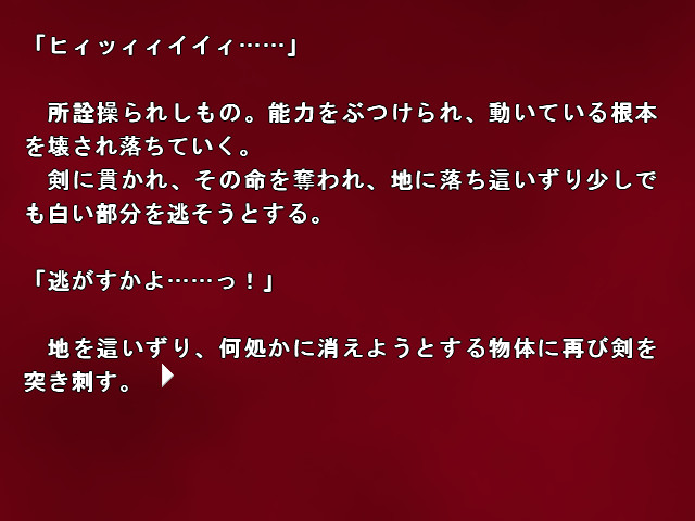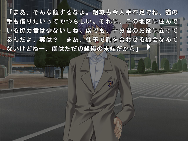 The world is breaking apart. City is full of suicides, murders and bizarre crimes. City is full of shadows, and main character hunts down such "crimson shadows" that used to be persons. His abilities are trained by a woman of a mysterious identity. Love only exists in fragmentary form in this eternal whirlpool of death.