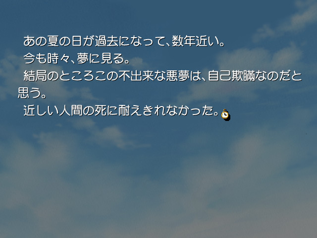 The story centers around a young boy by the name of Reiji Oumi. When his sister suddenly dies, Reiji, along with Kotori and Ryouko each withdraw, not wanting to accept the fact. Years have passed, and the three of them reunite back in their hometown and reminisce on the past events. Moby Games]