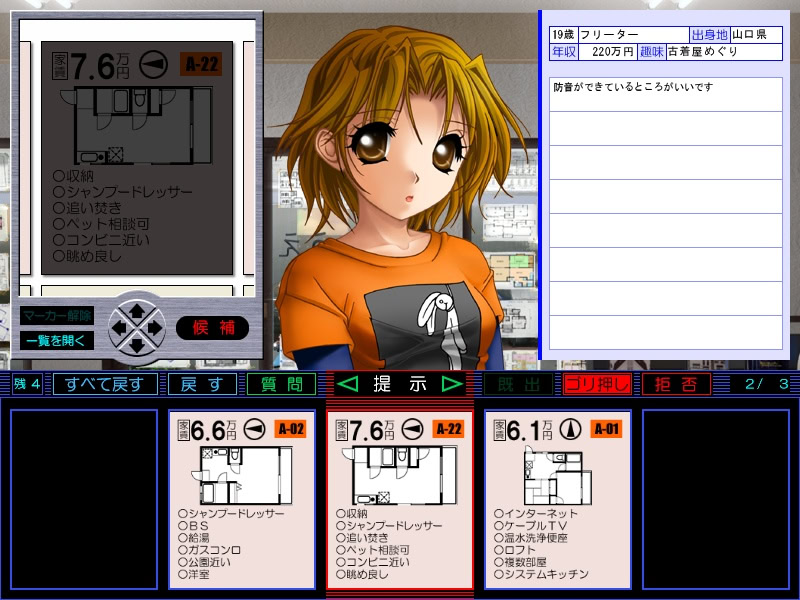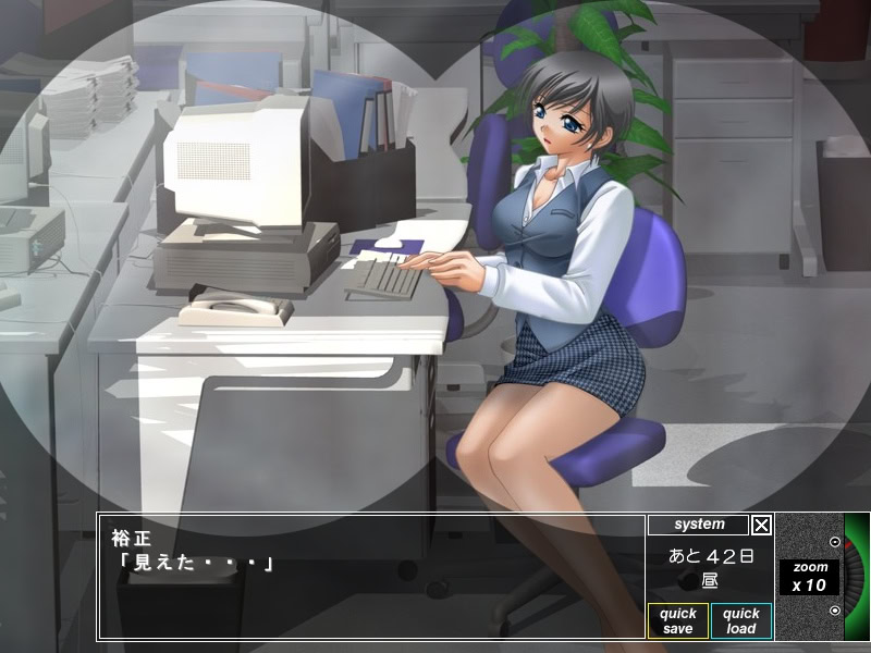 Main character is a university student who does real estate agent job as part-time work. He lends and sells apartments with peeping devices to cute girls and then blackmails them. vndbreview]