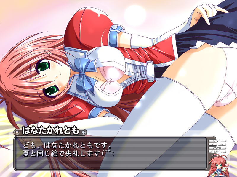 A girl suddenly jumps out of the doujinshi picked up on the way back from Comiket! For some reason this busty girl loves you! Earn points in mini-games to get to know her better. vndbreview]