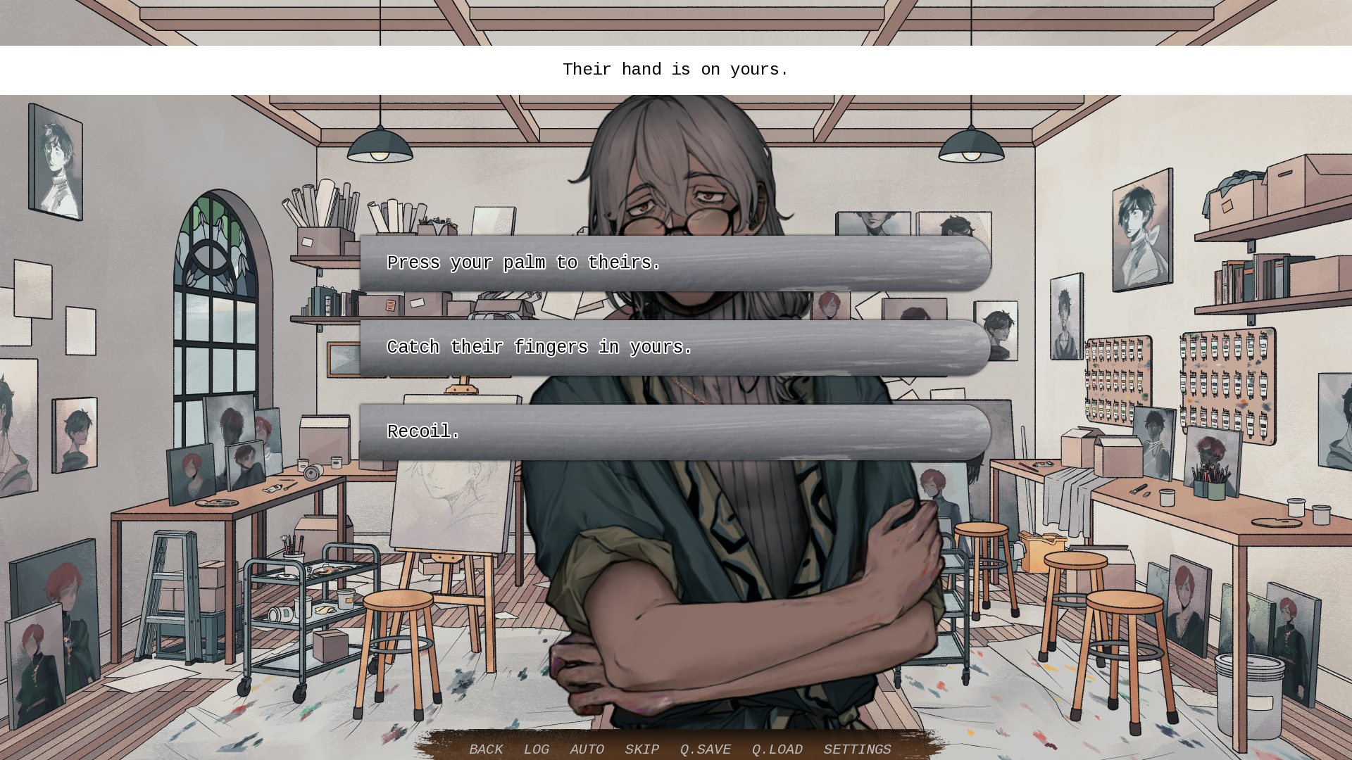 “That Which Surrounds” is a short visual novel about a grieving artist, whose longing for happier times has called something supernatural— you— into their studio. Your words can soothe a lonely heart… or you can break it, and see what grows in its place.