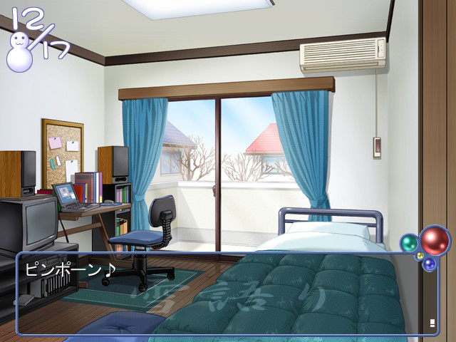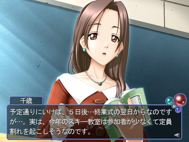 The game takes place in a snowy mountain area, where the protagonist takes part in a skiing course. Of course he isn't alone and, conveniently-enough, ends up with a lot of female company. (from RPGFan)