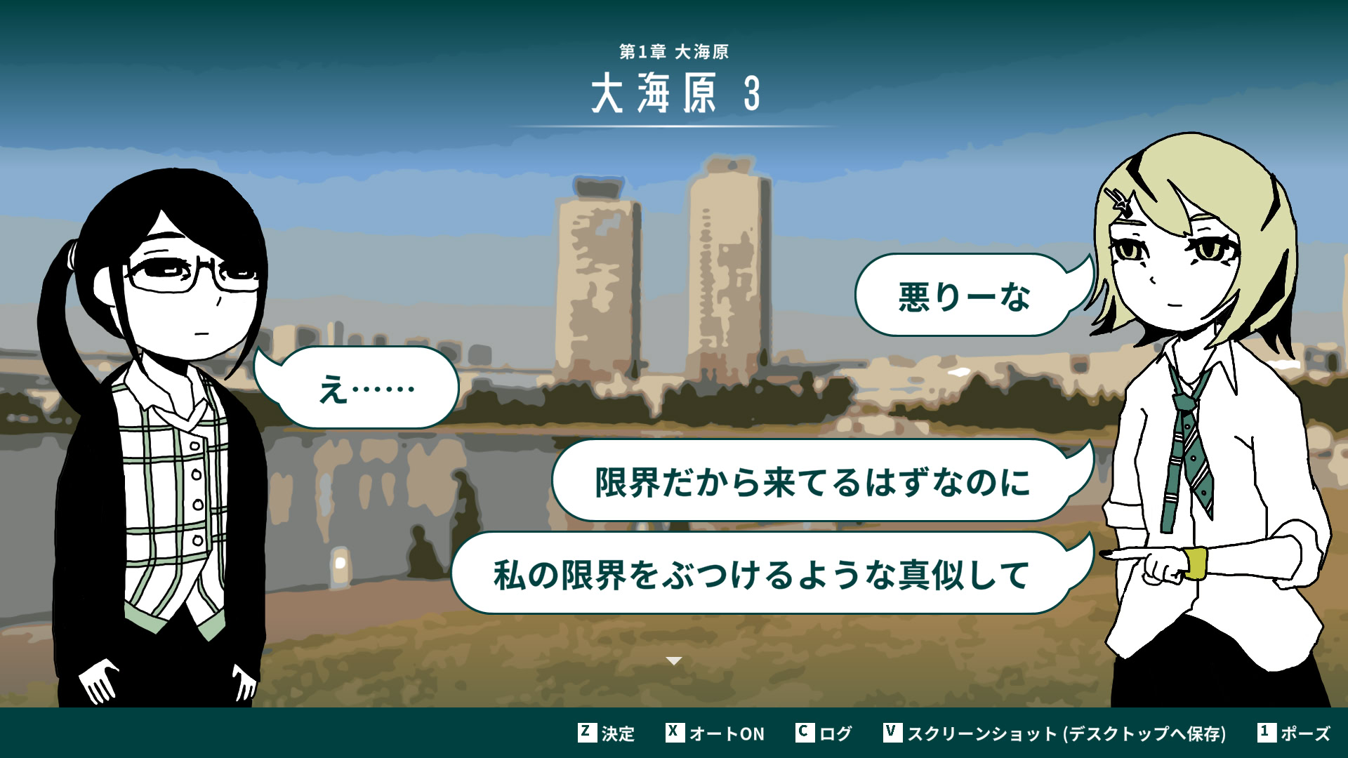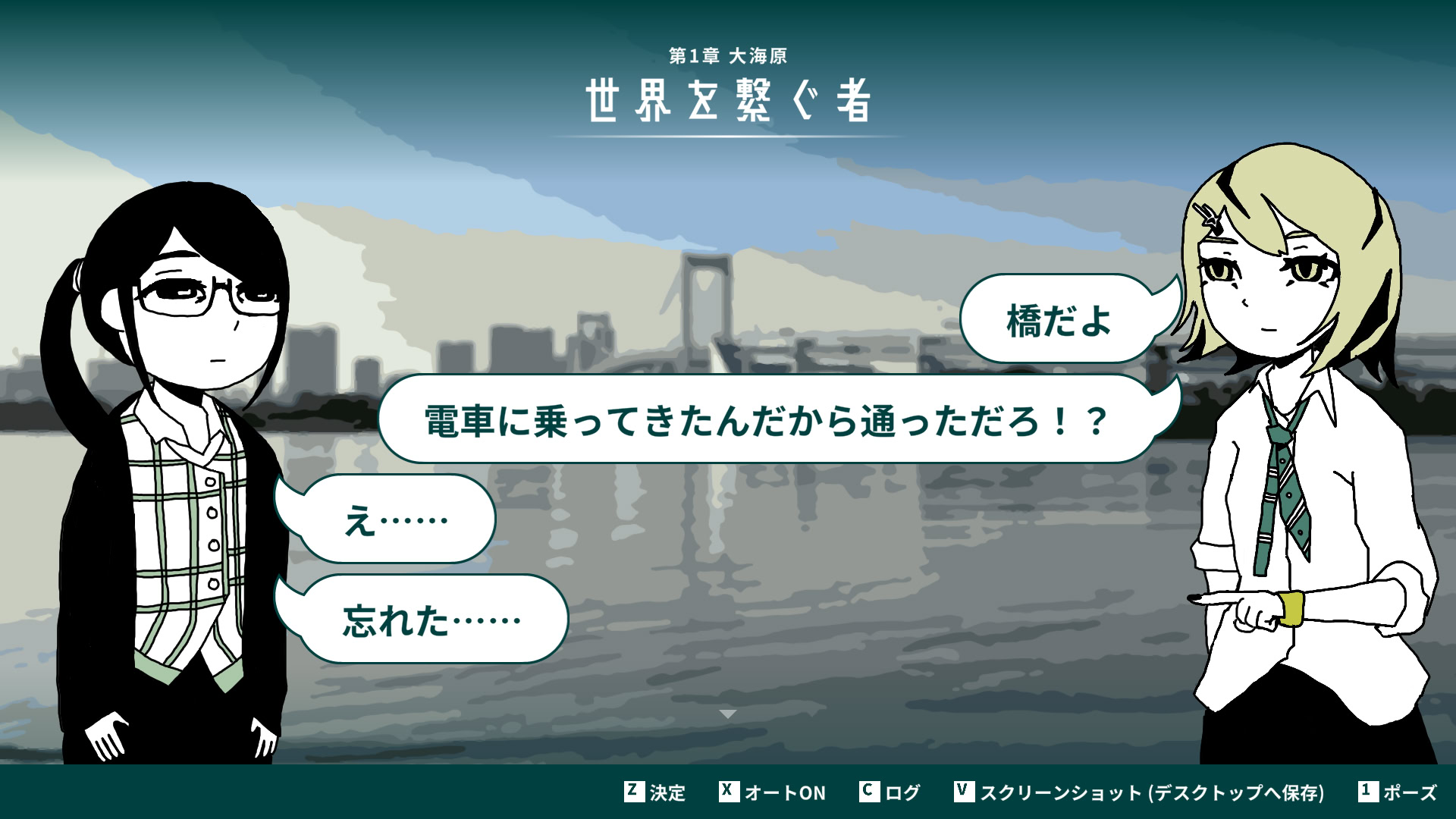 Tidal Therapy is a travel novel game for tired adults. A tired office worker heads to the sea. The setting is a quiet and beautiful sea town with a seaside park, warehouse district, and tower condominiums.