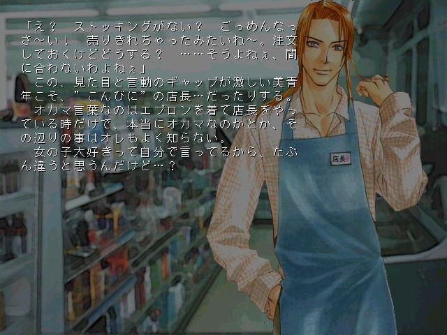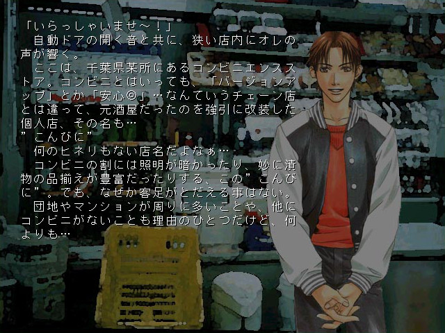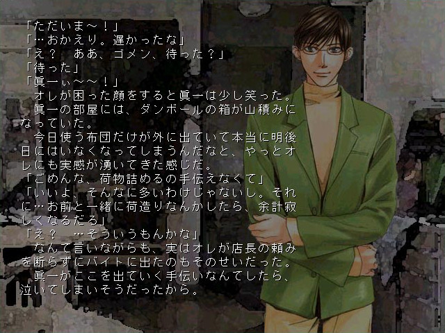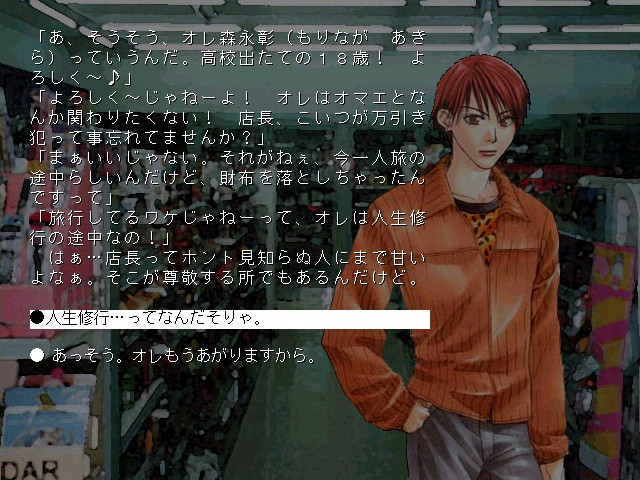 Main character lives in Chiba Prefecture and gets a job at a food shop. But he suffers from loneliness and is about to go to Okinawa where his neighbor Shinichi is supposed to get a job. But suddenly Shinichi arrives at the same food shop, and days obtain a much brighter coloring. vndbreview]