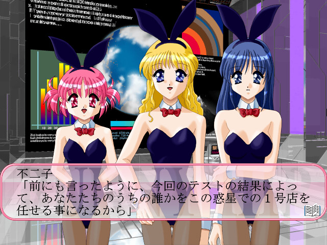 The porn bunny company group is going to expand its galaxy chain to the Earth. In order to investigate sexual orientation of the Earthlings, three girls are sent there. Main character is an ordinary unemployed man and he's chosen as a test object for a week. Every day main character needs to decid...