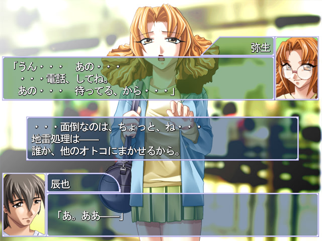 The protagonist parts ways with Washiba Yayoi, who he met on vacation, and gets on another train.