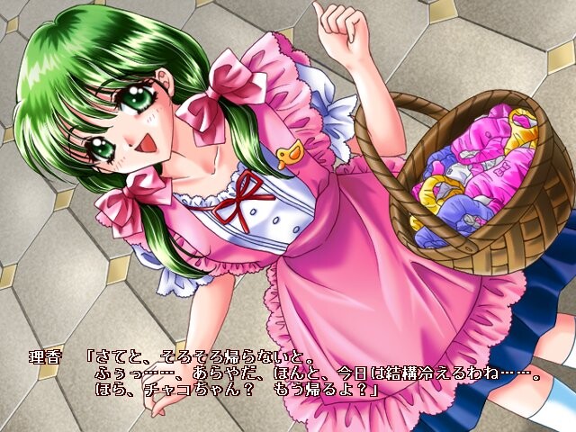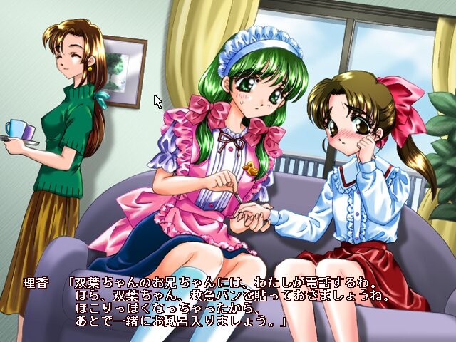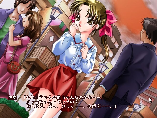 Futaba has just moved to a new place with her brother. Her kitten ran away and Futuaba got lost. She was found out by seller of pants Rika and delivered to the brother. Choices determine in which direction the story goes from there on. vndbreview]