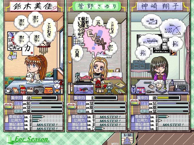 You are hired as a family tutor, and you pick three girls of your choice (from five) as your students. In six months time (July to January), you are to assist these three girls in getting into University. Anime Densetsu]