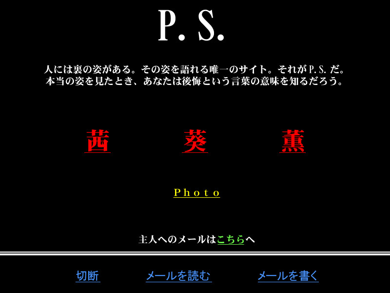 You play as a college student named Hiroyuki, and the story centers around an internet site called "P.S.". The site consists of five different women who live dual lives, as they each have a darker side to them that reveals their true sexual identities. There is Akane, an elevator girl who is into ex...