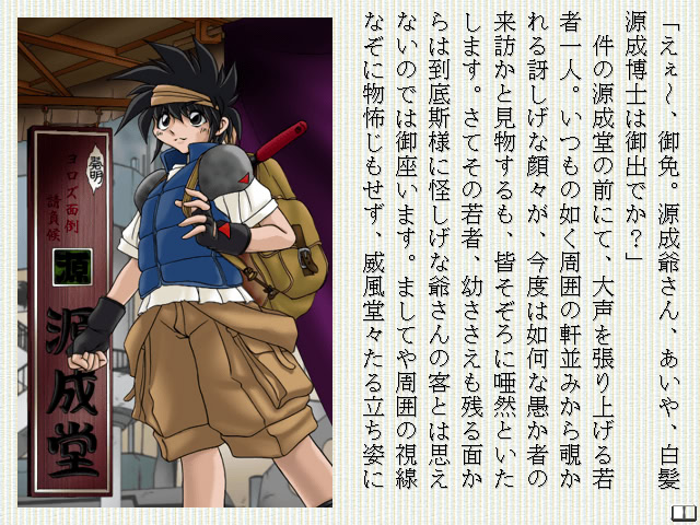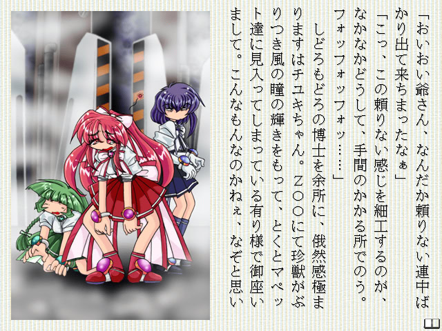 Near future. Inventor created three automatic muppet dolls. The story starts as a boy and a girl find them. vndbreview]